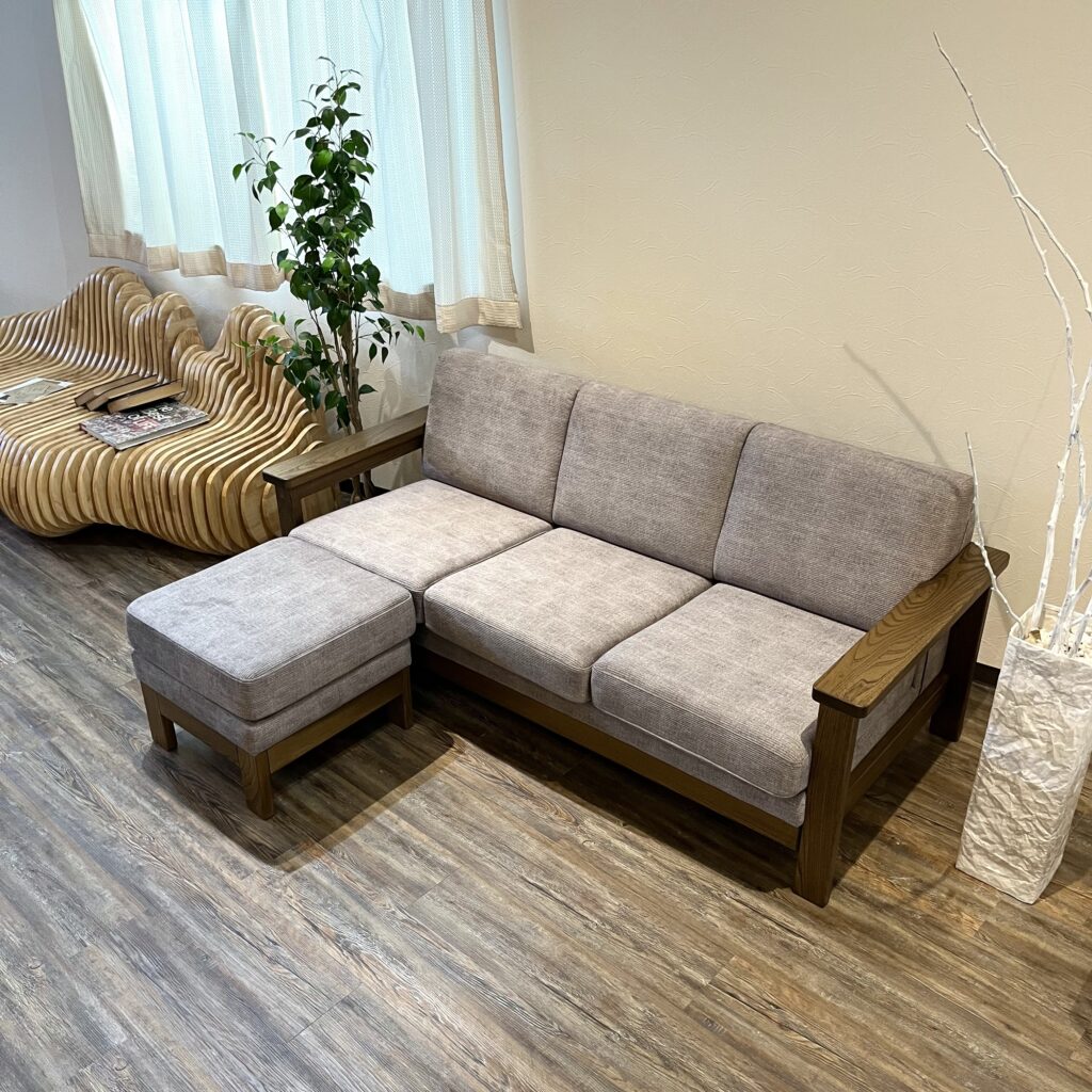こちらの写真は3人掛けM(幅179cm)とオットマンです。張地はKS-6、ニレ無垢材の色はブラウンです。ご参考ください。