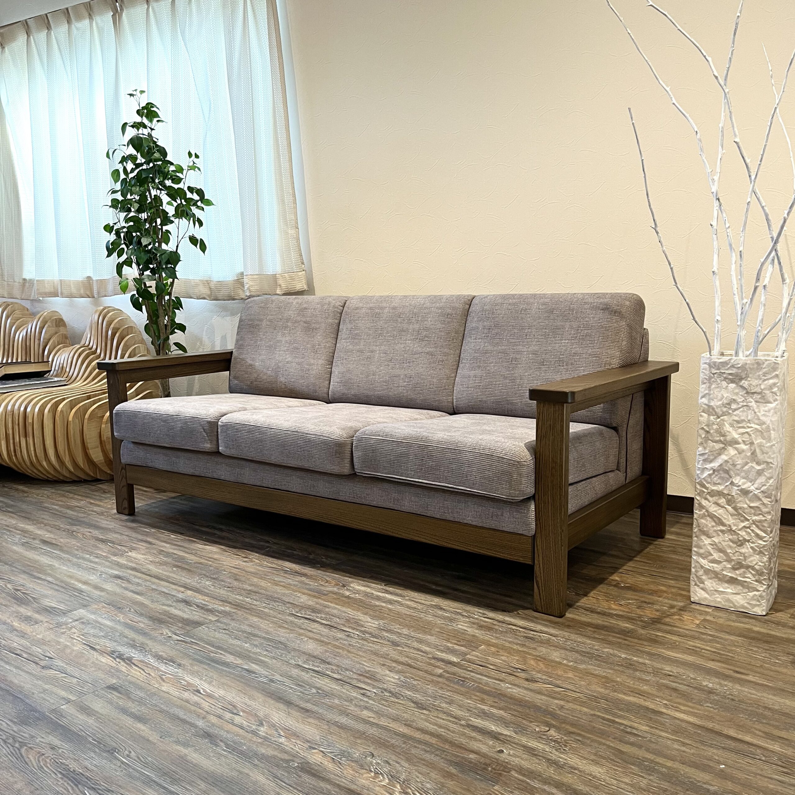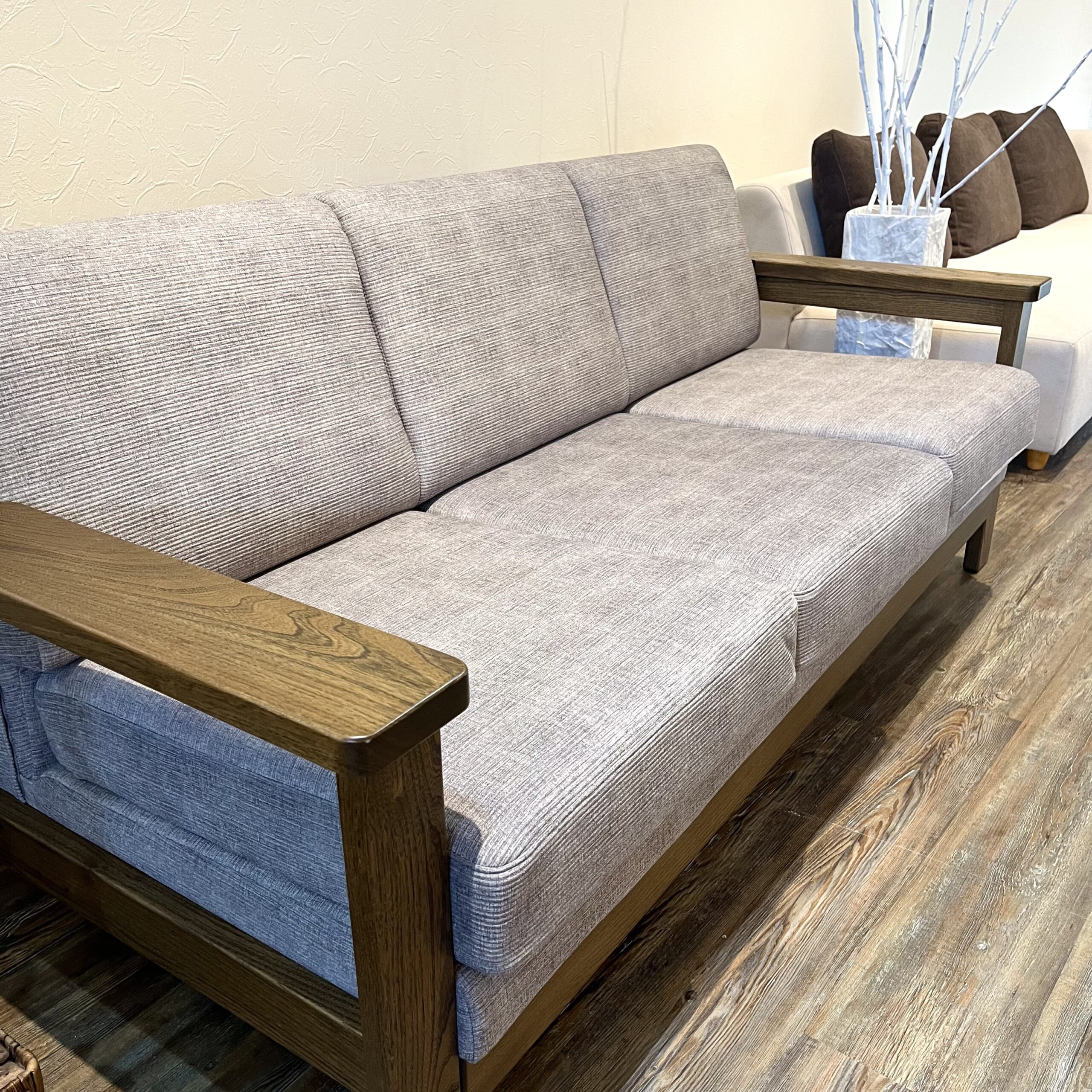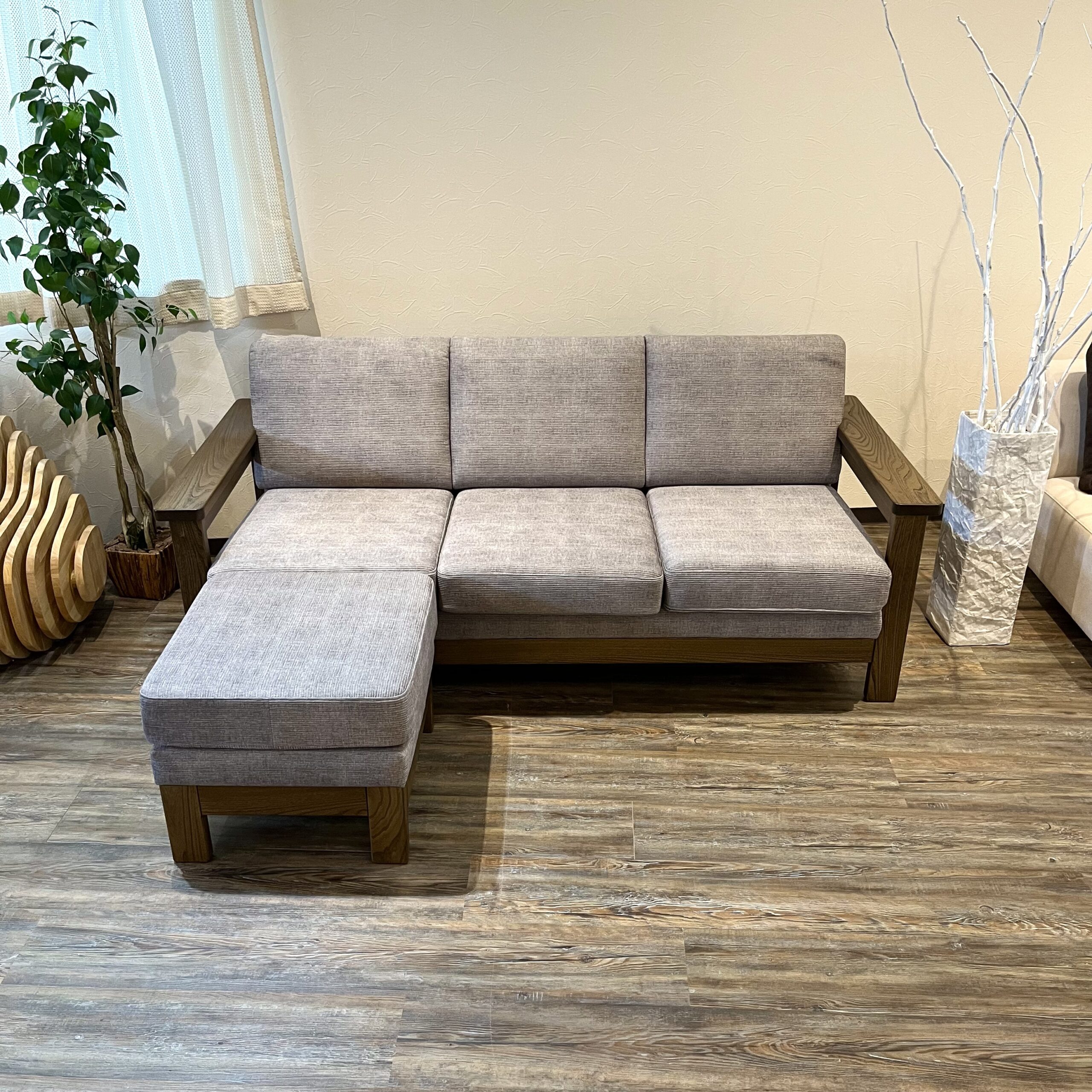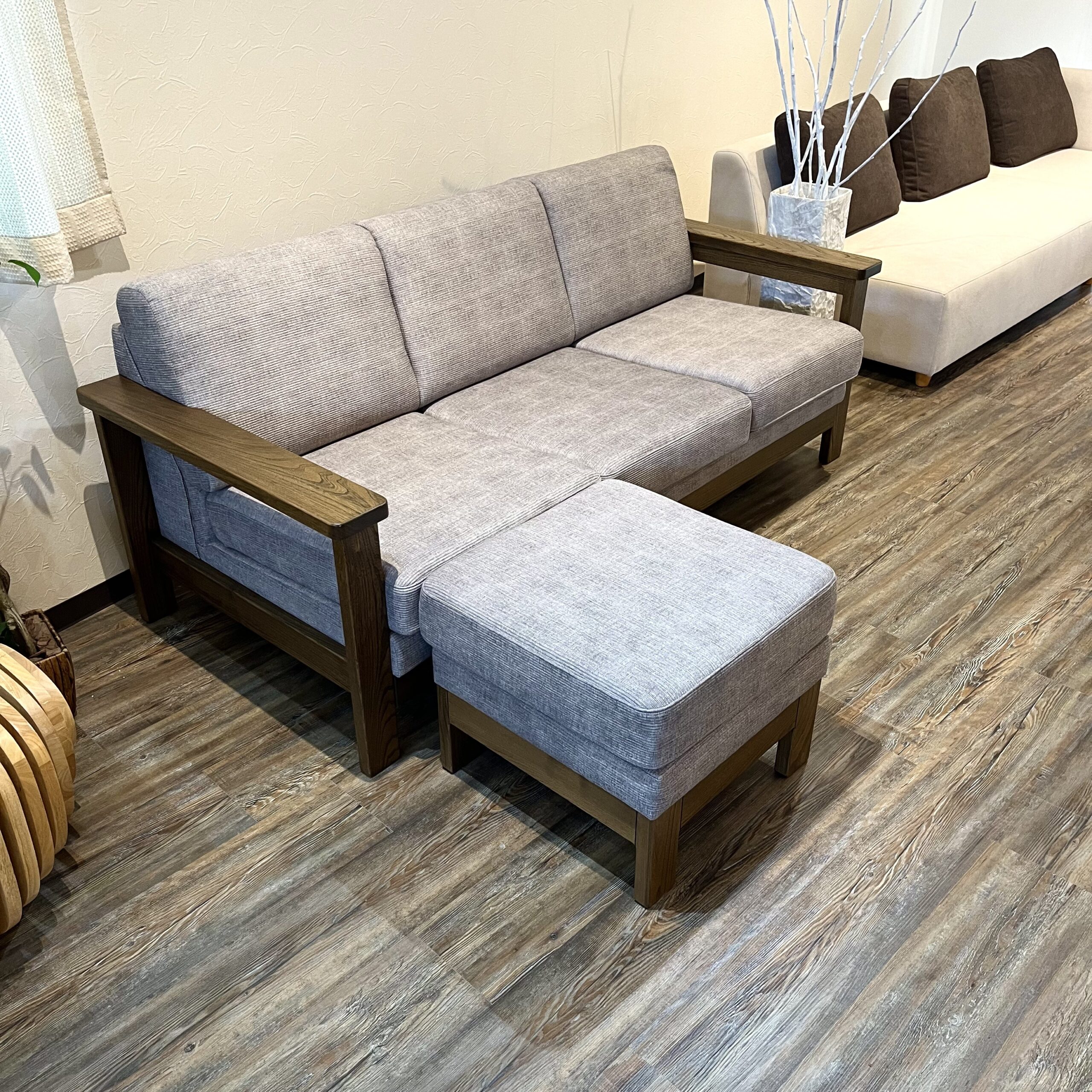 こちらの写真は3人掛けM(幅179cm)とオットマンです。張地はKS-6、ニレ無垢材の色はブラウンです。ご参考ください。